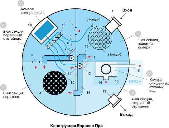 Конструкция Евролос Био представляет из себя цилиндр с горловиной, выполненный из монолитного полипропилена. Внутри цилиндра с помощью перегородок выделены три камеры, последовательно сообщающиеся между собой через щели и патрубки в перегородках, расположенные на определенной высоте.